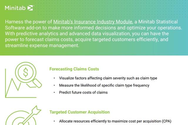 有了 Minitab 的保险行业模块,您就不必通过学习统计学来分析数据。我们的解决方案使您能够实时收集数据或稍后进行分析。您将能够轻松地解释您的发现以进行改进,从而帮助您提高收入、预测成本并提高客户满意度。